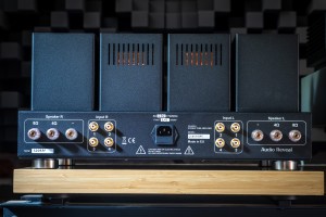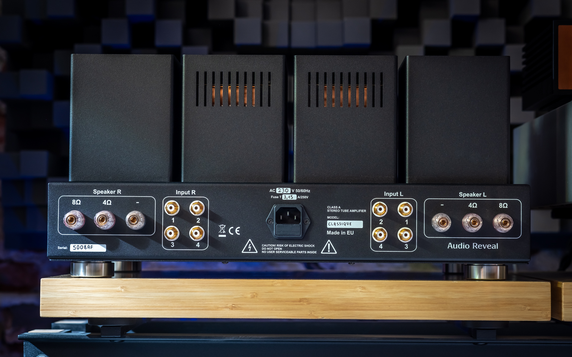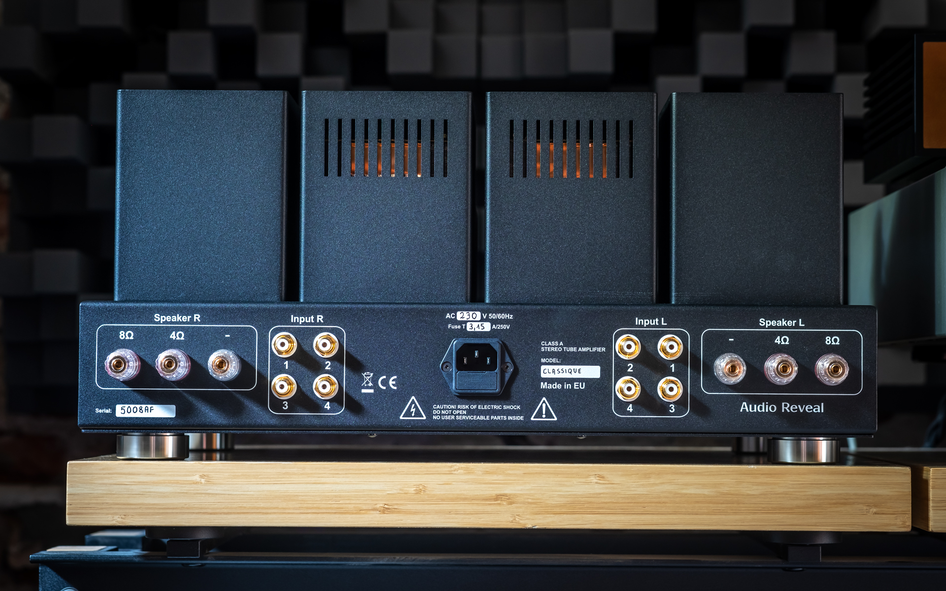 Wszystkie wzmacniacze Audio Reveal to klasyki lampowego gatunku, do czego nazwa modelu Classique nawiązuje bez pudła. Jego masywna baza pokazuje lampy w całej okazałości, za nimi siedzą w sumie cztery transformatory (dwa głośnikowe po bokach i dwa zasilające w środku) w osobnych puszkach, a dwie mniejsze to dławiki dla lamp wyjściowych i sekcji przedwzmacniacza. Gałka po lewej stronie drewnianego (gatunek merbau) frontu to główny włącznik. Po uruchomieniu wzmacniacza, dwukolorowa dioda LED umiejscowiona kawałek dalej miga na czerwono przez minutę, po czym już na zielono sygnalizuje pełną gotowość do pracy. Umieszczone centrycznie, masywne pokrętło reguluje opartą na analogowym potencjometrze głośnością, zaraz obok jest okienko dla odbiornika podczerwieni, a wybierak wejść zamontowany został daleko po prawej stronie. Classique siedzi na czterech aluminiowych nóżkach z gumowymi O-ringami. Symetrycznie podzielony tył ma wejście IEC środku, dalej są po lewej i prawej są kwadry pokrytych złotem mosiężnych wejść RCA, a zamontowane blisko krawędzi bocznych przyłącza głośnikowe mają osobne odczepy dla obciążeń 4/8 Ω, które bez problemu przyjmą każdą kablarską konfekcję.