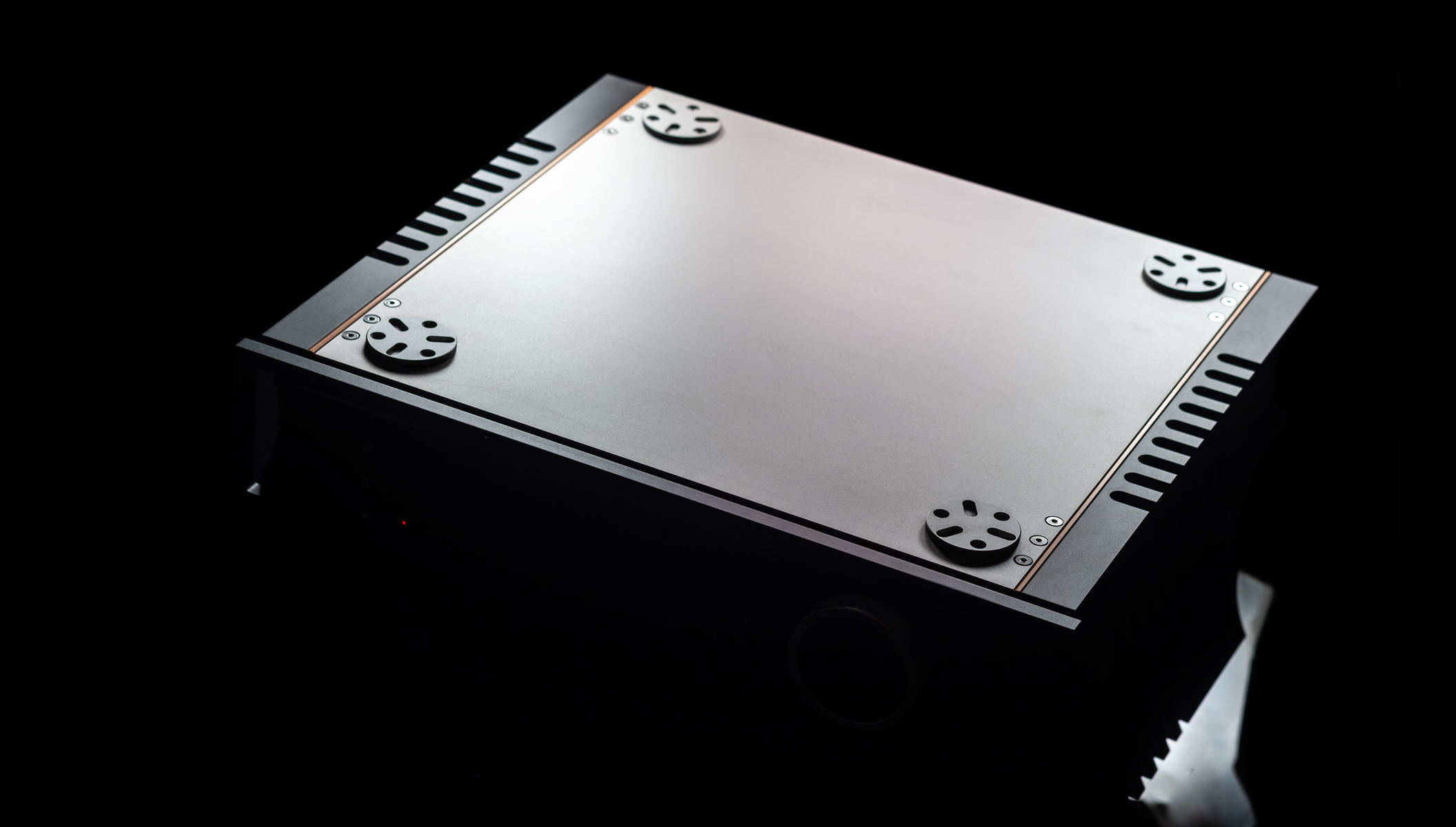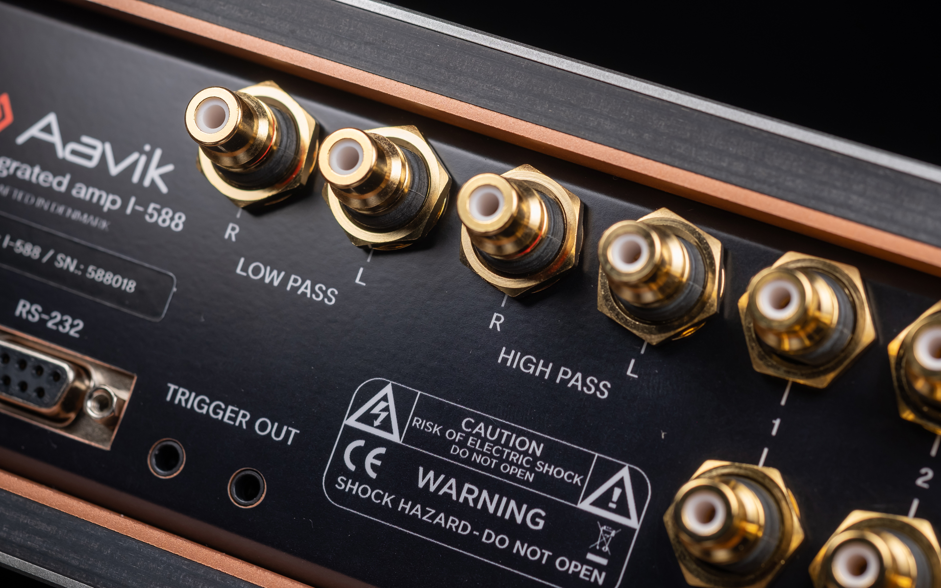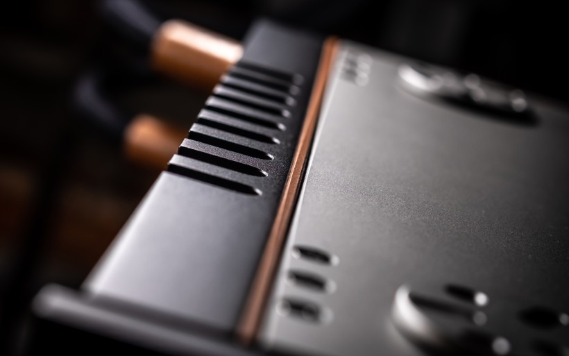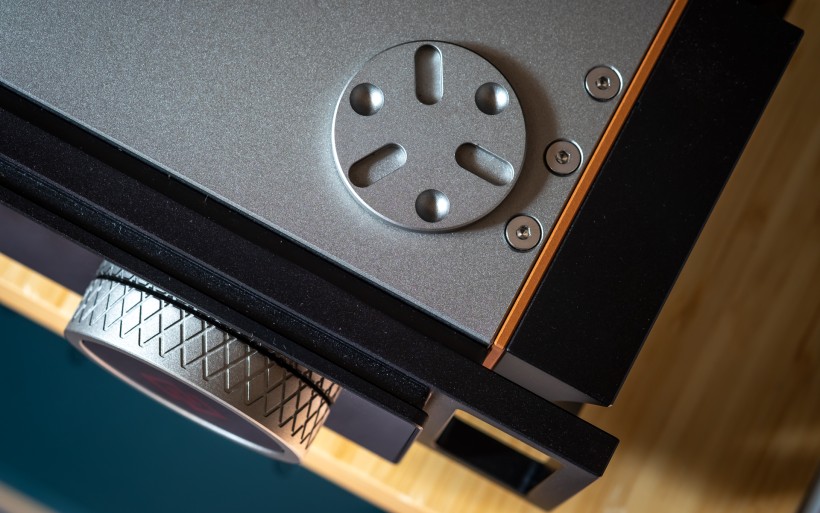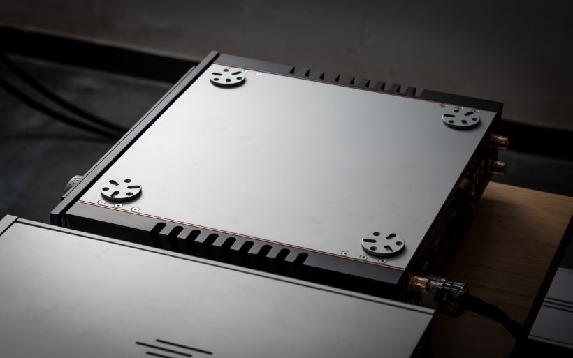 From the side the I-588 looks just as impressive as from the front. Its concave flanks contrast with the convex cheeks of the I-880, while inside they connect to heavy copper walls that form a shielded chamber to protect the circuitry from airborne noise. What used to be exclusive to Aavik’s most expensive models is now standard across the line, and here it’s paired with the company’s familiar thick wood-composite sandwich top and bottom panels to suppress vibration. Four round inserts on the top allow stacking with other Aavik components, either directly or via the optional Ansuz Darkz decouplers. The former connection requires a dozen ball bearings, the latter wants twice as many. The amp sits on four large footers designed to interface seamlessly with those pucks, hiding them almost entirely while still ensuring contact with a rack shelf. Around the back, the I-588 features solid but conventional speaker terminals, a fused IEC power inlet, trigger and software update ports, and a practical array of RCA connections; five line-level inputs, along with dedicated main input and separate high-pass (24dB/oct.), low-pass (12dB/oct.), and preamp outputs.