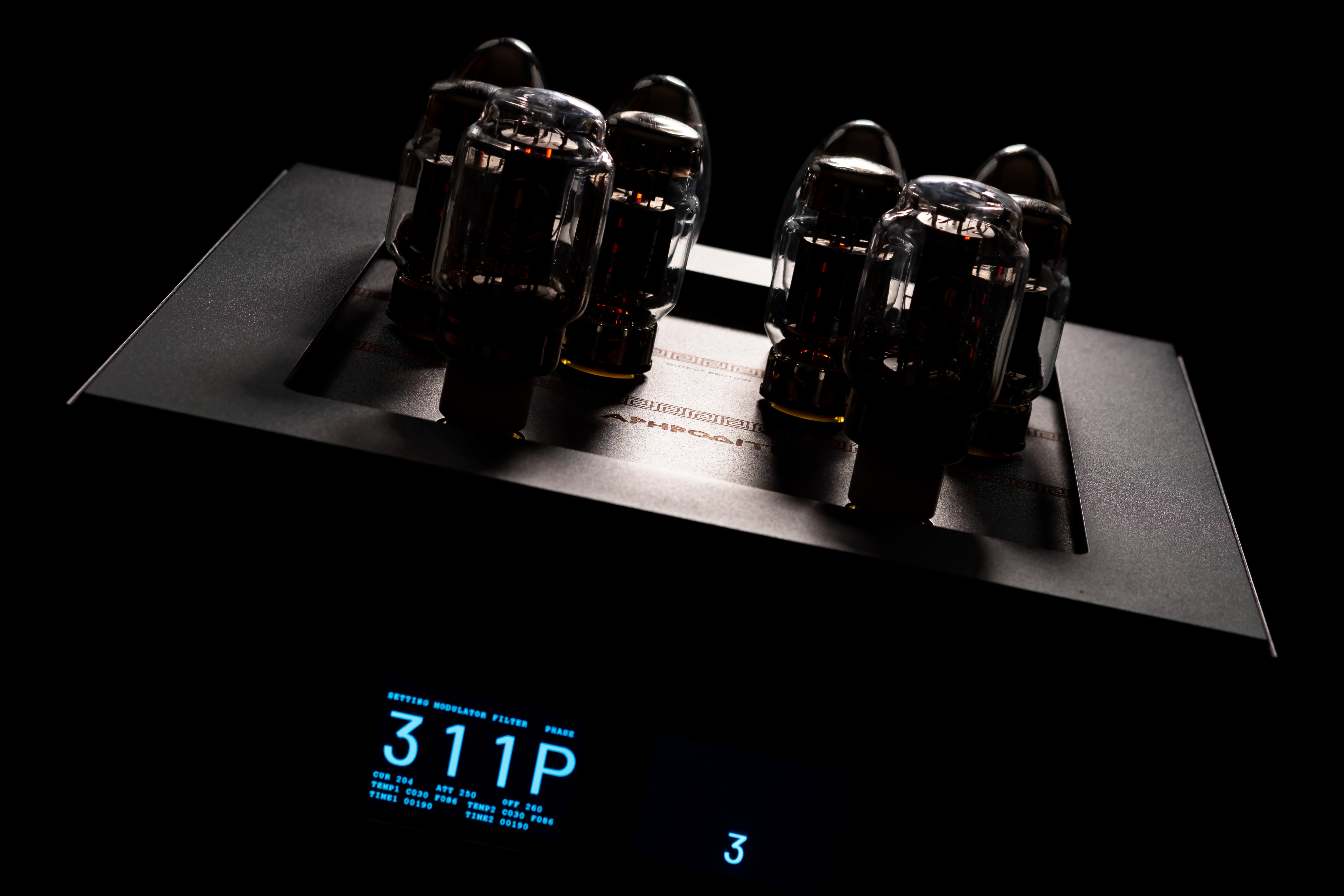 Considering all the above, it appears that the Horizon360 and Aphrodite share only their digital stage and pentode-driven outputs. Although they look similar, the Aphrodite’s front panel has undergone significant changes. The two-digit Nixie display has been replaced with a dual OLED screen positioned behind an acrylic window, accompanied by four embedded pushbuttons for input selection, playback muting, and power control. One of the Aphrodite’s displays shows the currently selected digital input and, during playback, the sample rate — otherwise, it remains muted by 90% and that’s by design. The other screen can display either the Greek goddess logo or a stream of technical data reminiscent of a service terminal that normally is off-limits to regular users. From left to right, this display shows the currently selected setting bundle (1–8), digital filter (1–6), modulator (1–6), and phase (N or P). For example, “135N” indicates the first saved setting group, followed by the third filter, fifth modulator, and negative phase. Because the tubes in the output stage reverse phase, the negative setting is effectively positive. The smaller display in that area shows clock counters for the tubes and DAC, as well as the internal temperatures of the PSU and mains transformer. Once I selected my preferred digital filter (4) and modulator (4), I haven’t touched these settings since, and I also kept the entire OLED section fully dim most of the time. I’m sure some Aphrodite owners will appreciate the wealth of information and options this machine provides, though personally, Nixie digits on the Horizon360’s forehead appeal to me far more.